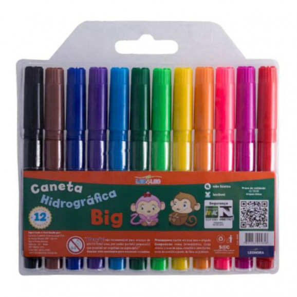 Caneta Hidrográfica Big Jumbo Leo e Leo 12 Cores tem formato oitavado, cores intensas, ponta 5,5mm, traço de 1,5mm, tinta lavável, corpo na cor da tinta e tampa antiasfixiante.