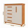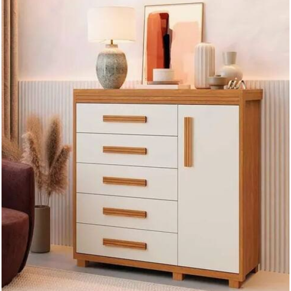 Estrutura 100% mdf- 5 gavetas amplas com corrediças telescópicas- 1 porta com excelente espaço interno- 2 prateleiras móveis, para melhor organização de sapatos, bolsas e outros objetos- Puxadores em mdf- Pés em madeira maciça- Reforço de fundo de gaveta