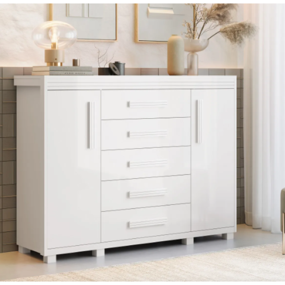 Transforme seu quarto com a elegância da Cômoda Havana. Com design moderno e imponente, ela combina estilo e praticidade para quem não abre mão de organização com um toque de sofisticação. São 5 gavetas amplas com corrediças telescópicas, que deslizam com suavidade e garantem durabilidade, além de 2 portas laterais que ampliam o espaço interno para acomodar tudo com praticidade.
