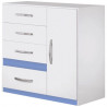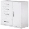Os Puxadores são cromados, para contribuir ao design, o acabamento é em impressão UV com verniz alto brilho, para dar mais resistência. Possui 4 gavetas com corrediças metálicas e 1 porta.