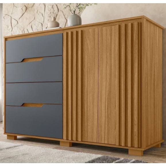 Com visual contemporâneo, a Cômoda Texas oferece 4 gavetas com corrediças telescópicas, portas com detalhes ripados e dobradiças com amortecedor de 3,5cm. Os puxadores usinados e os pés em PVC completam o design sofisticado e funcional, ideal para complementar o ambiente com organização e estilo.