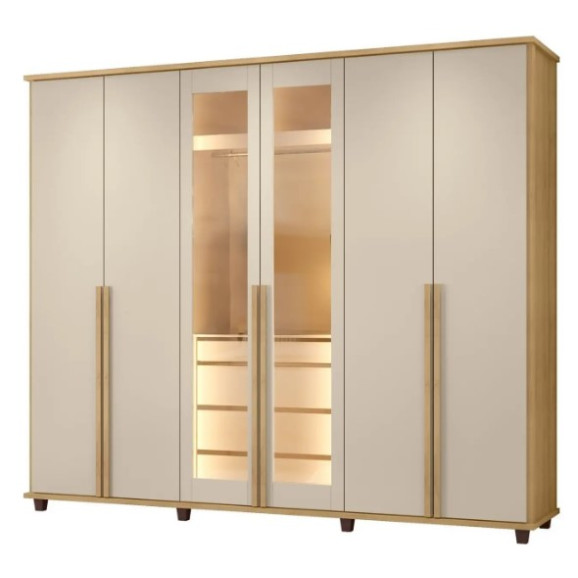 Desfrute de 6 portas, 5 gavetas com corrediças telescópicas para abertura suave, 5 cabideiros em alumínio e 8 nichos internos para organização impecável. Uma prateleira adicional e uma gaveta organizadora complementam o interior, que possui acabamento na cor do produto. O grande diferencial é a Iluminação LED interna, que proporciona visibilidade e sofisticação, facilitando a escolha de suas roupas.