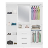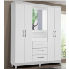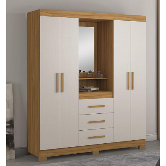 O roupeiro com 4 portas e 3 gavetas, sendo as gavetas com corrediça metálica, 3 prateleiras internas, possui 6 pesinhos, um cabideiro e uma calceiro, puxador das gavetas e portas em plástico, possui um nicho com espelho, produto ideal para quem está procurando algo boa distribuição de espaço e excelente preço não esquecendo da qualidade. Recomendações de Uso, Manutenção e Limpeza: Para maior durabilidade, recomenda-se que a limpeza do móvel seja feita da seguinte forma: Nas partes externas (portas, laterais e frente da gaveta) e internas, a limpeza deverá ser feita com pano limpo e levemente umedecido em água e sabão neutro. Em seguida, utilizar um pano limpo e seco.