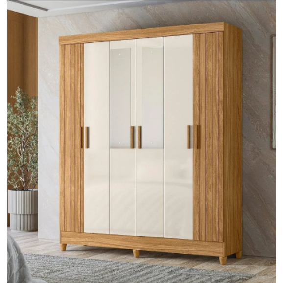 Guarda roupa Uruguai conta com 6 portas tendo espelhos nas duas portas centrais e detalhes frisados nas portas laterais, puxadores em MDF, 2 gavetas internas com corrediças metálicas, pés em PVC que facilitam a limpeza -