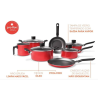 As peças possuem corpo de 1,2 mm de espessura em alumínio com pintura antiaderente, o que assegura a durabilidade. Cabos, alças e puxadores são feitos em baquelite, material que não aquece, proporcionando conforto e ergonomia no manuseio. As tampas são de vidro temperado com bordas em aço inox e saída de vapor, permitindo a visibilidade durante o preparo dos alimentos.